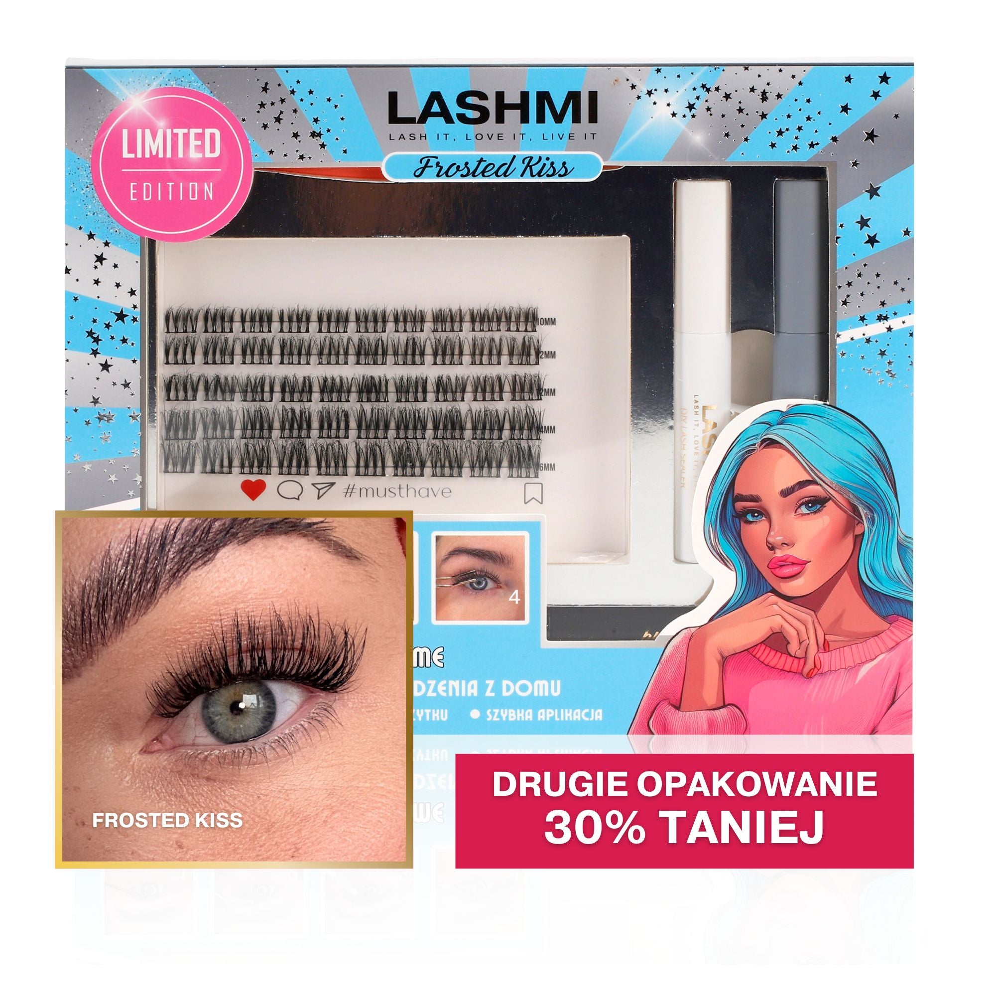 Zestaw Frosted Kiss został stworzony z myślą o kobietach, które chcą uzyskać efekt świeżych, lekkich rzęs DIY z subtelnym podbiciem objętości. Kępki są miękkie, komfortowe w noszeniu i wielokrotnego użytku, a cała aplikacja trwa zaledwie kilka minut. Stylizacja utrzymuje się nawet do 7 dni, bez wizyty u stylistki.